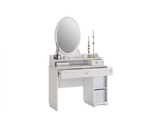 Трюмо из серии «Белла» – настоящая находка для истинных леди. Трюмо сочетает в себе утонченный дизайн, функциональность и удобство. Столешницу из МДФ украшает фрезеровка. Декоративная кисть на ручке окончательно подчеркнет изящество изделия.